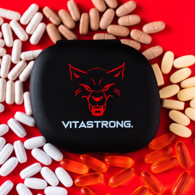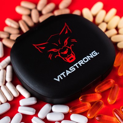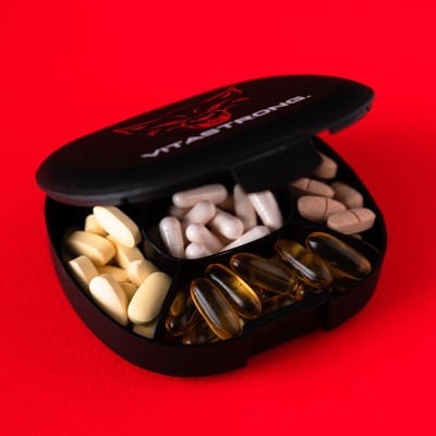 El pastillero VitaStrong es la solución ideal para todos los deportistas que toman diversos tipos de suplementos en forma de pastillas, vitaminas, minerales, etc.
