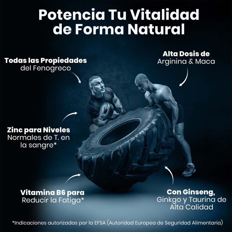 Ingredientes: Base de L-Arginina, extracto seco de maca andina (Lepidium meyenii Walp., raíz) tit. 0,5% beta-ecdisona, cubierta de la cápsula (agente de recubrimiento: hidroxipropilmetilcelulosa, óxido de zinc); extracto seco de cordyceps (Cordyceps sinensis (Berk.) Sacc., cuerpo fructífero del hongo) tit. 30% polisacáridos, extracto seco de fenogreco (Trigonella foenum-graecum L., semilla) tit. 50% saponinas totales, antiaglomerantes: sales magnésicas de ácidos grasos, dióxido de silicio; extracto seco de ginkgo biloba (Ginkgo biloba L., hoja) tit. 24% de flavonoides de ginkgo y 6% de lactonas terpénicas totales, extracto seco de ginseng (Panax ginseng CA Mey., raíz) tit. 12% ginsenósidos, L-taurina, bisglicinato de zinc, clorhidrato de piridoxina (Vitamina B6).