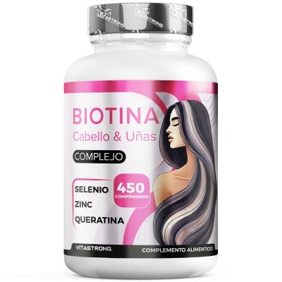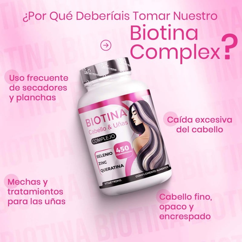 Vitastrong Biotin Complex es un suplemento diseñado específicamente para favorecer la salud del cabello y las uñas. Su fórmula combina Biotina, Zinc y Selenio – nutrientes clave para mantener un cabello sano – con una selección de ingredientes activos funcionales como Keratina Hidrolizada, extracto de Bambú (rico en silicio), Vitamina E, Vitamina D y Cobre.