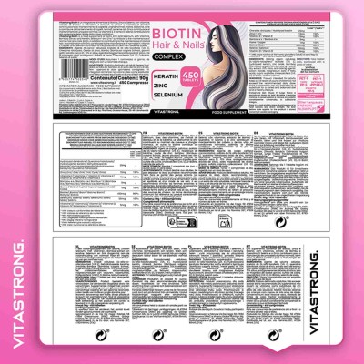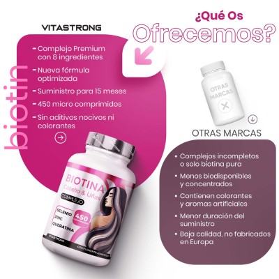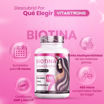 El complejo de biotina Vitastrong actúa desde adentro, proporcionando nutrientes clave para apoyar el crecimiento, la fuerza y la belleza natural del cabello y las uñas. La biotina (vitamina B7) es esencial para la síntesis de queratina, mientras que el zinc, el cobre, el selenio y las vitaminas E y D realizan una acción sinérgica antioxidante y de soporte celular. La adición de queratina hidrolizada y extracto de bambú completa la acción estético-estructural.