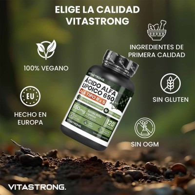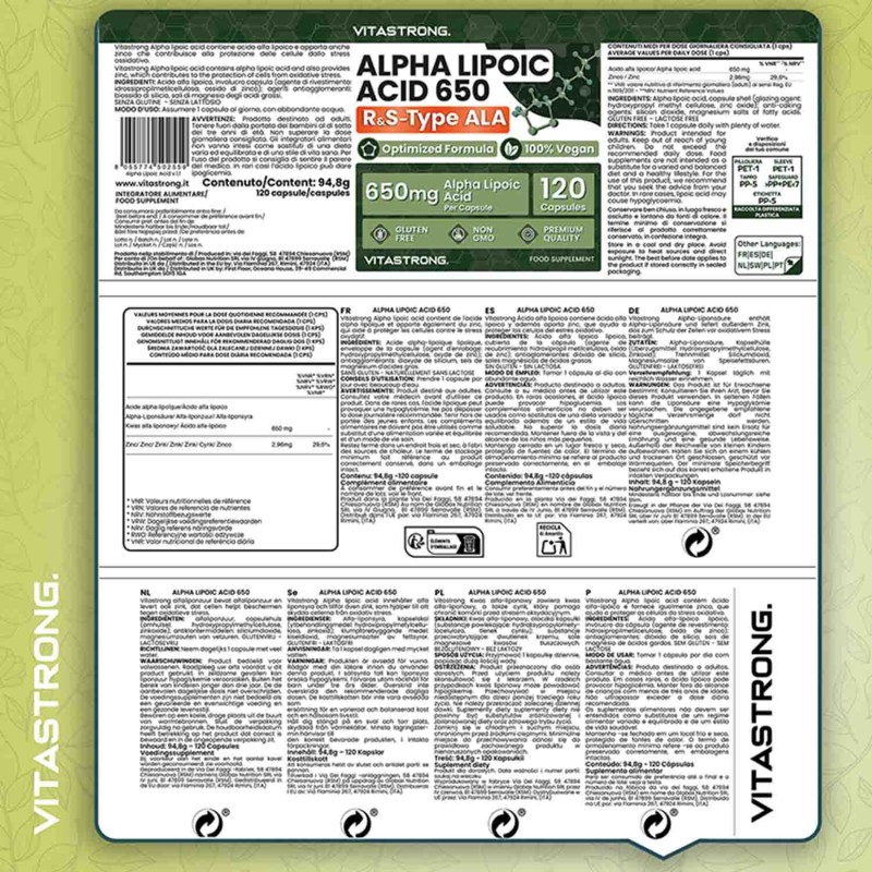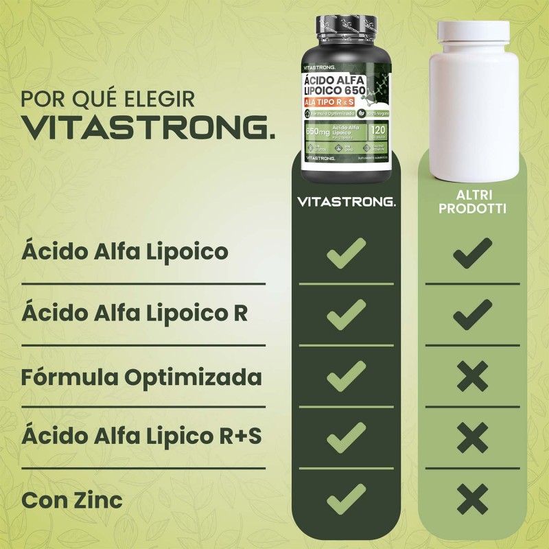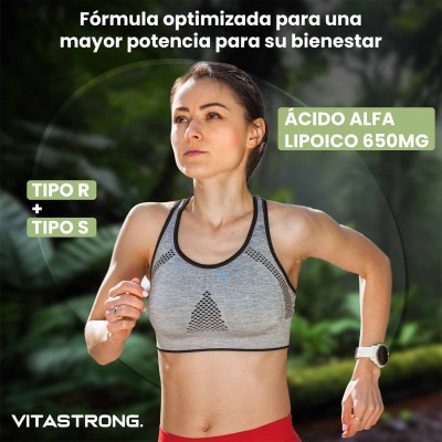 Vitastrong Alpha Lipoic Acid 650 es un suplemento de alta potencia a base de Ácido Alfa Lipoico (ALA) , una molécula antioxidante universal que actúa tanto en ambientes acuosos como lipídicos, protegiendo las células del estrés oxidativo.
