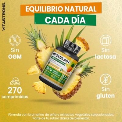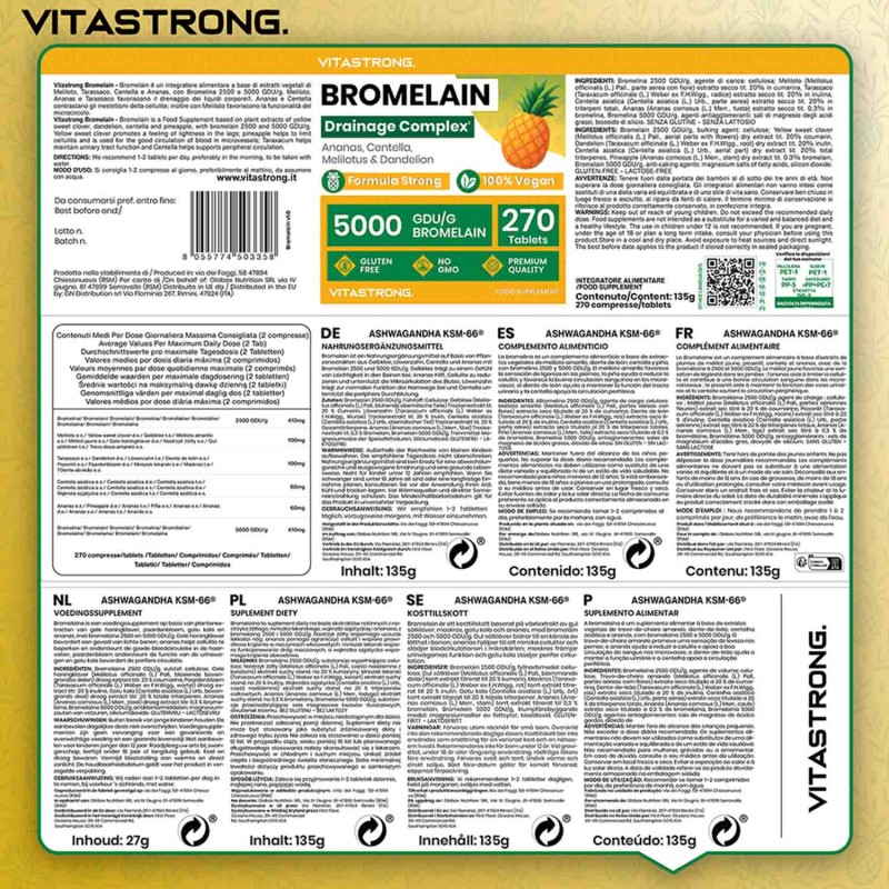 Ingredientes: Bromelina 2500 GDU/g, agente de carga: celulosa; extracto seco de trébol dulce (Melilotus officinalis (L.) Pall., parte aérea con flor) titulado al 20% en cumarina; extracto seco de diente de león (Taraxacum officinale (L.) Weber ex FHWigg. , raíz) titulado al 20% en inulina; extracto seco de centella asiática (Centella asiatica (L.) Urb., parte aérea) titulado al 20% en triterpenos totales; extracto seco de piña (Ananas comosus (L.) Merr., tallo) titulado al 0,3% en bromelina; bromelina 5000 GDU/g; antiaglomerantes: sales magnésicas de ácidos grasos, dióxido de silicio. SIN GLUTEN – SIN LACTOSA