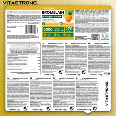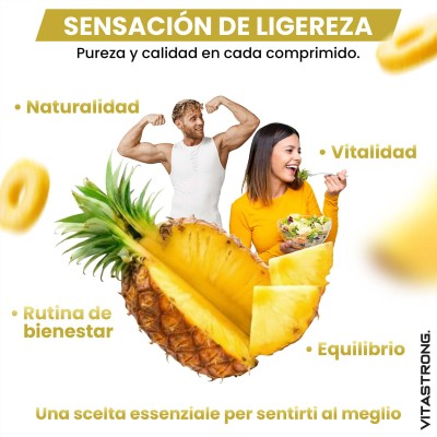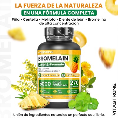 Bromelain Drainage Complex es un suplemento avanzado formulado con bromelina con alta actividad enzimática (5000 GDU/g) y una mezcla de extractos naturales de piña, centella asiática, meliloto y diente de león.
