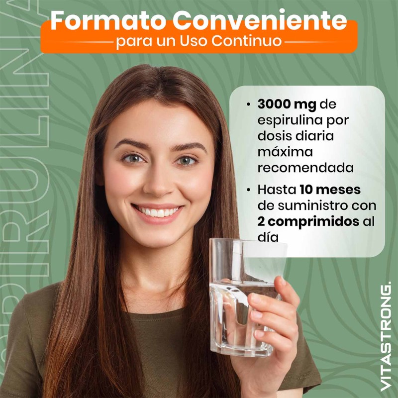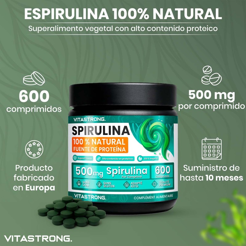 El envase de 600 comprimidos garantiza una suplementación de larga duración, lo que convierte a Spirulina Vitastrong en una opción práctica y conveniente adecuada para cualquier dieta.