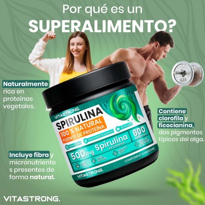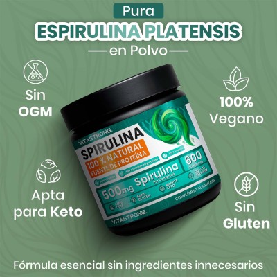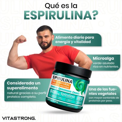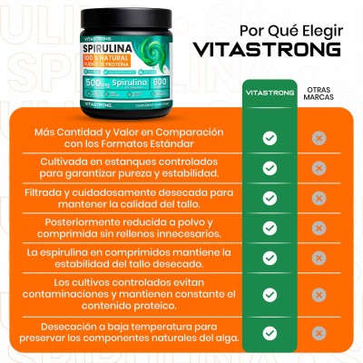 Vitastrong Spirulina es un suplemento en tabletas formulado con 100% de espirulina pura , una microalga naturalmente rica en proteínas, vitaminas, minerales y antioxidantes.