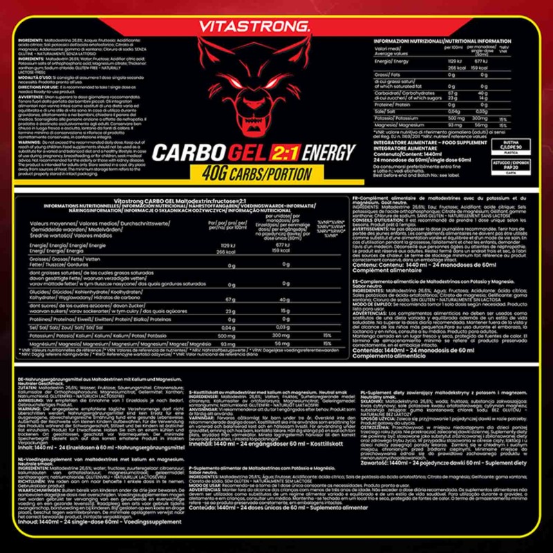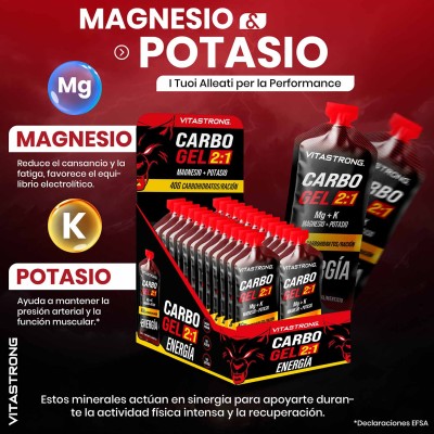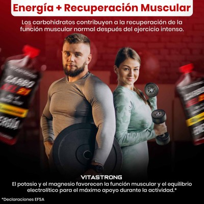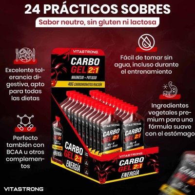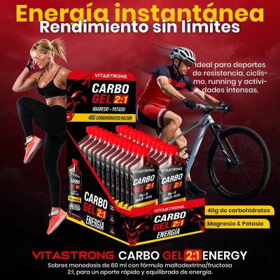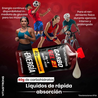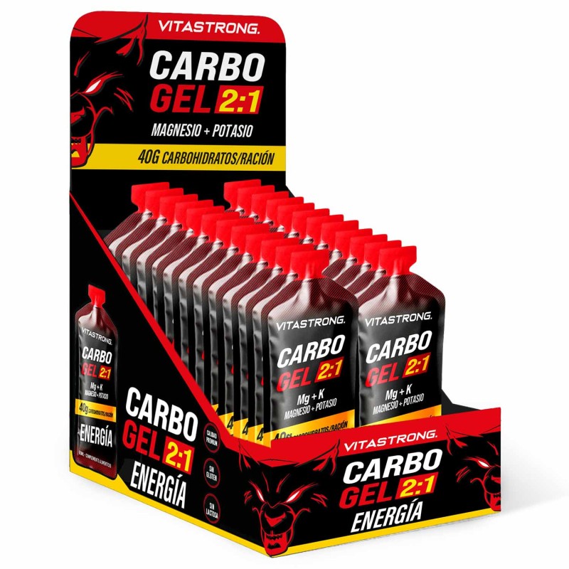 CARBO GEL 2:1 de Vitastrong es un gel energético listo para usar, diseñado para proporcionar energía rápida y sostenida durante la actividad física. Contiene maltodextrina y fructosa en una proporción de 2:1 , una mezcla optimizada para maximizar la absorción intestinal y reducir el riesgo de trastornos gastrointestinales (1). Cada sobre aporta 40 g de carbohidratos , ideal para deportes de resistencia o entrenamiento intenso.