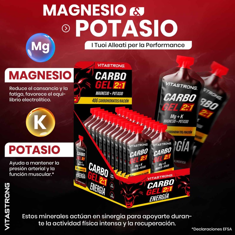 En comparación con los geles energéticos comunes, CARBO GEL 2:1 presenta un perfil óptimo de carbohidratos para una rápida asimilación y una mejor tolerabilidad.¹ La presencia de minerales clave (Mg + K) favorece la función muscular, mientras que su fórmula líquida y práctica permite su consumo incluso en movimiento, sin necesidad de agua.