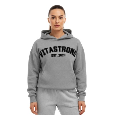 La sudadera con capucha universitaria gris combina comodidad, volumen y estilo. Una sudadera unisex de corte holgado , diseñada para quienes viven el espíritu Vitastrong incluso fuera del gimnasio.