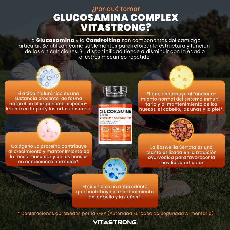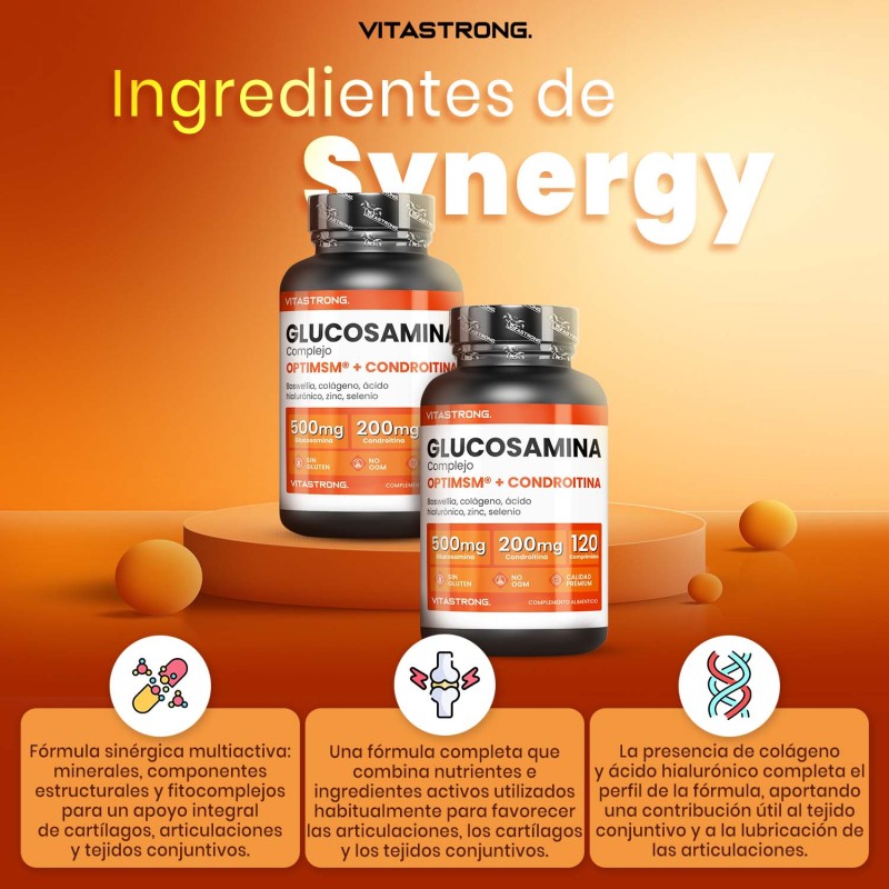 Nace de una potente sinergia de glucosamina, condroitina y OptiMSM®, enriquecida con Boswellia , colágeno hidrolizado , ácido hialurónico , zinc y selenio , para ofrecer un apoyo completo y específico.