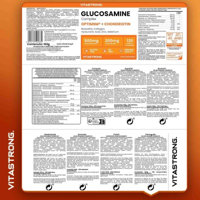 Ingredientes: Clorhidrato de glucosamina vegetal, agente de carga: celulosa microcristalina; sulfato de condroitina sódica, es de boswellia (Boswellia serrata Roxb. ex Colebr., gomorresina) tit. 65% ácido boswélico, OptiMSM (metilsulfonilmetano), colágeno hidrolizado COLLinstant®, Pido-Zinc (pidolato de zinc), hialuronato sódico, antiaglomerantes: sales magnésicas de ácidos grasos, dióxido de silicio; L-selenometionina, bisglicinato de manganeso.