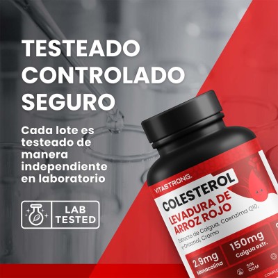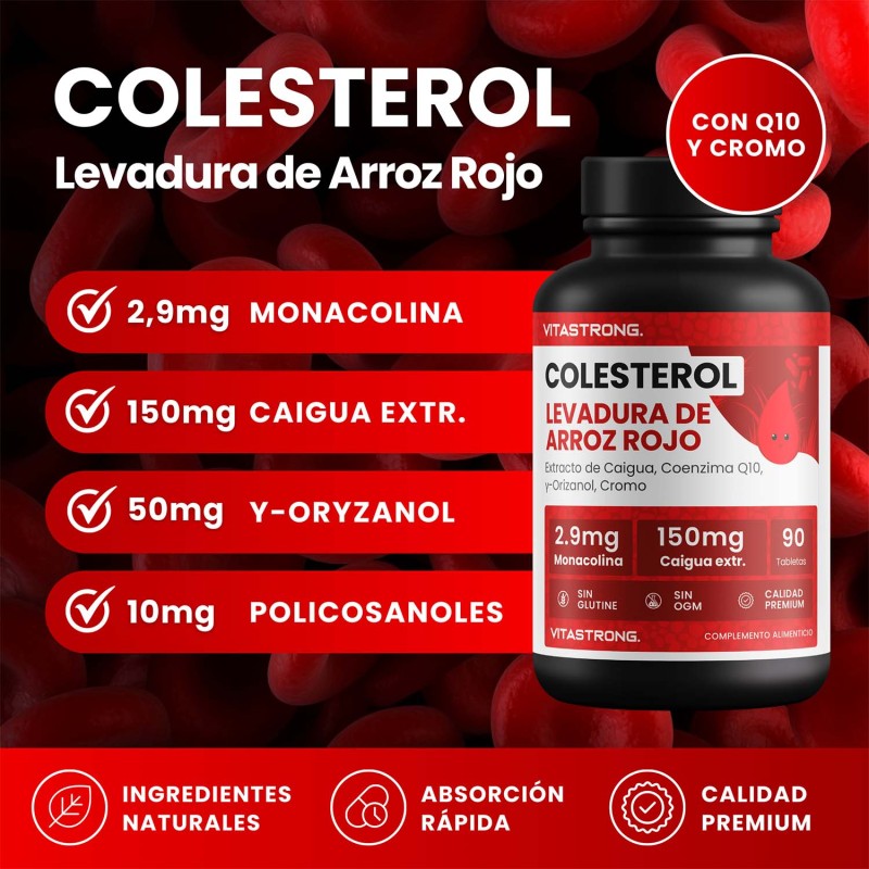 Vitastrong Cholesterol es un suplemento completo a base de arroz rojo fermentado, extracto de Caigua, gamma orizanol, policosanoles, cromo y Coenzima Q10. Su fórmula sinérgica está diseñada para promover el metabolismo de los carbohidratos y el colesterol.