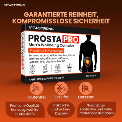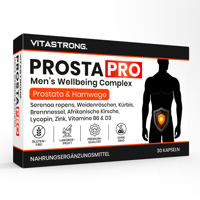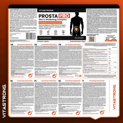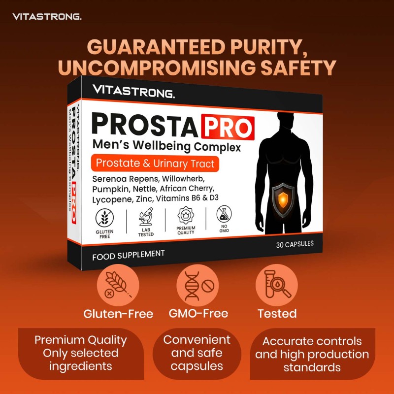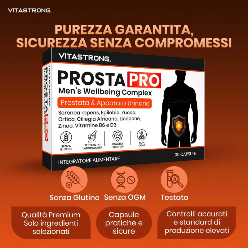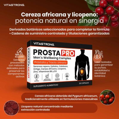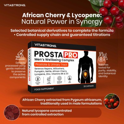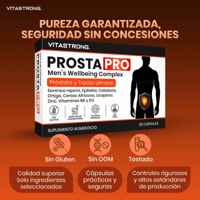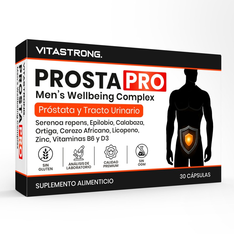 PROSTA PRO es un suplemento avanzado diseñado para el bienestar masculino , formulado con extractos naturales titulados de Serenoa Repens, Epilobium, Semillas de Calabaza, Ortiga, Pygeum y Licopeno , en sinergia con zinc y vitaminas B6 y D3 .