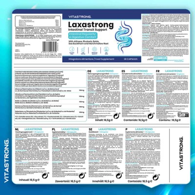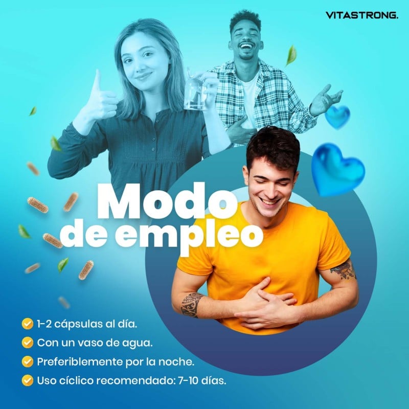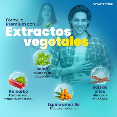 Vitastrong Laxastrong es un suplemento diseñado para quienes sufren de irregularidad intestinal, hinchazón o estreñimiento ocasional. Su fórmula sinérgica, a base de extractos de plantas (como ruibarbo, boldo, espino amarillo y raíz de malvavisco), actúa de forma suave pero eficaz para favorecer la motilidad intestinal natural, sin causar irritación ni dependencia.